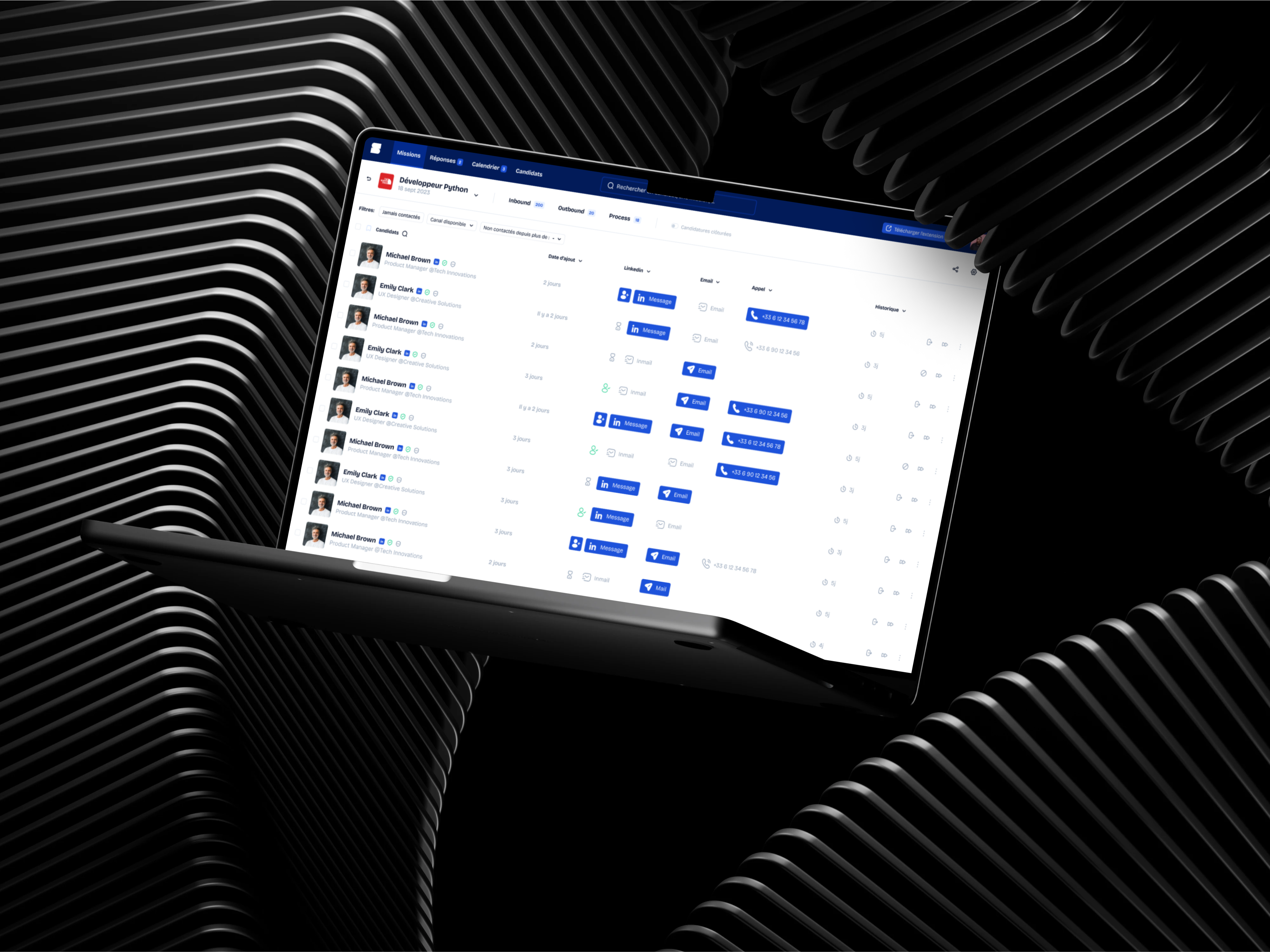 Sourcing des candidats, séquences d’approches directe, analyse et qualification par IA, messagerie centralisée, coordination des process,...
